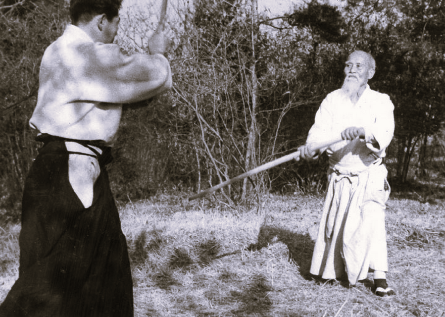 However, it doesn't seem that O'Sensei used this stance very much, which is a great classic of the Japanese sword schools. And I'd like to take this opportunity to point out that the photo below of a training session in Iwama with Morihiro Saito has nothing to do with waki no kamae. It is a rising cut, probably initiated from the chudan no kamae position, and after turning the blade upwards and opening the body to the left side, one of O Sensei's favourite techniques: