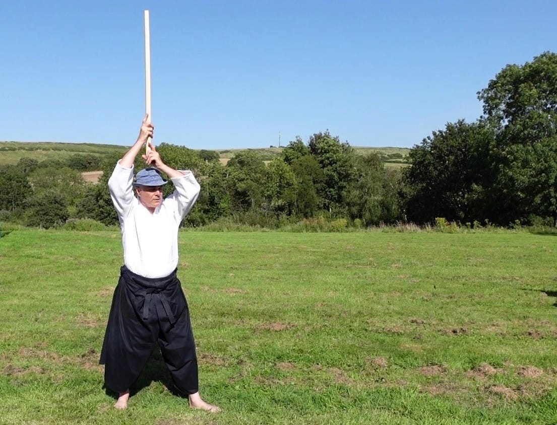 The third suburi of the aiki-ken asks the student to first adopt the chudan no kamae guard, then to change his position from there to the waki no kamae guard, and finally to strike shomen uchi from this last guard.