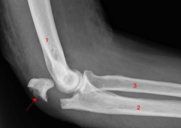 If the ikkyo technique is then applied martially, the result looks like the image below. There is a fracture of the olecranon, possibly displacement of the radius (3) and ulna (2), or even fracture of the humerus (1):